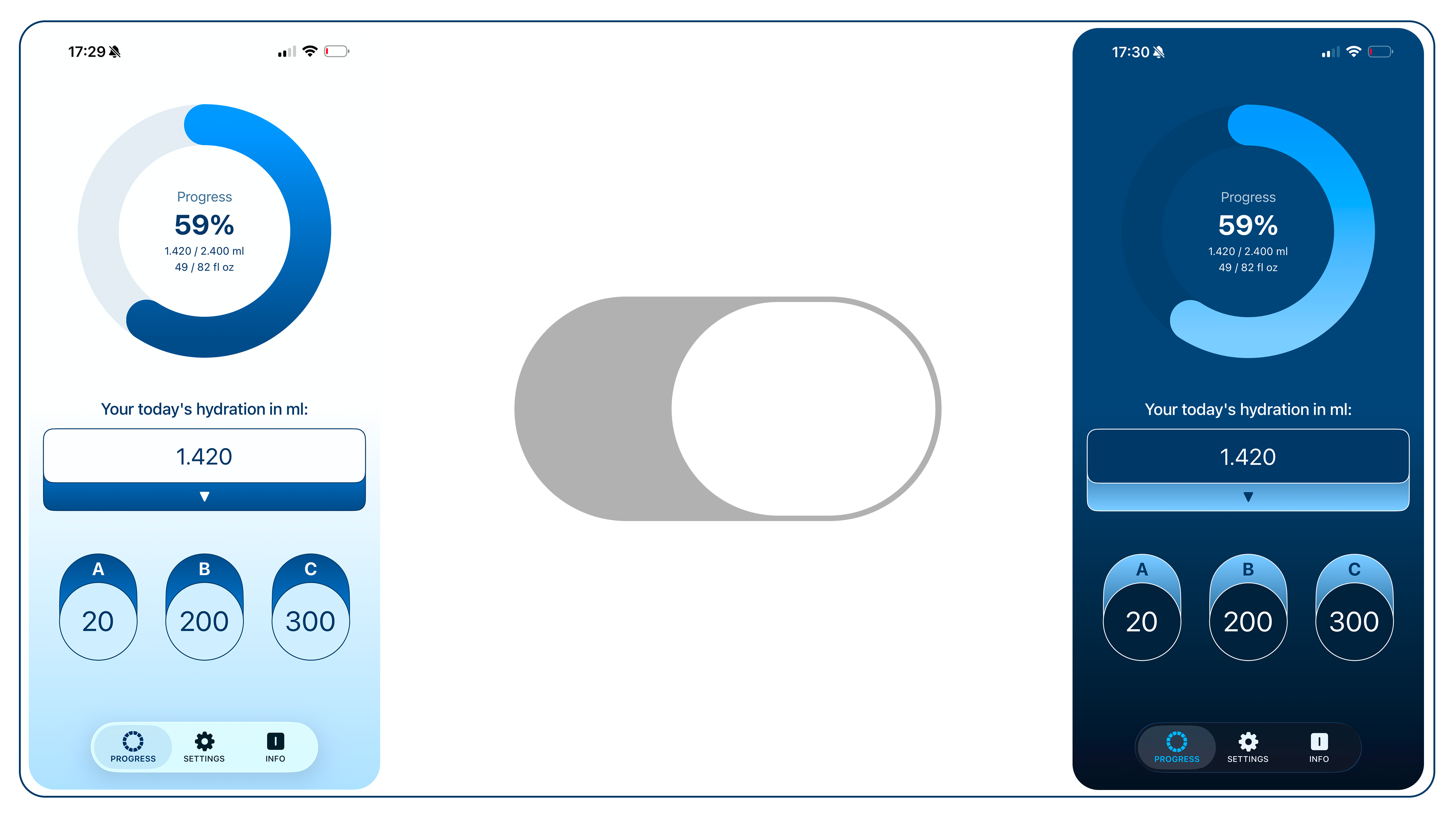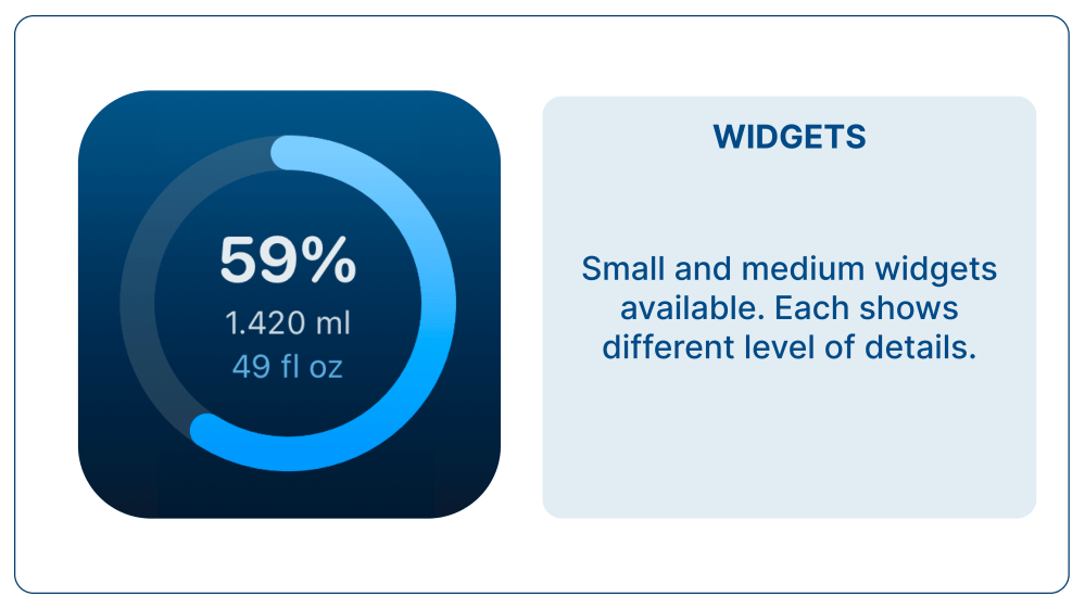 BlueLio offers two widget sizes — small and medium — so you can choose the one that fits your screen and needs. Both display your current water intake and daily target at a glance, while the medium widget provides more detailed progress information. With widgets, you can quickly track your hydration without opening the app, making it easier to stay on top of your daily goals.