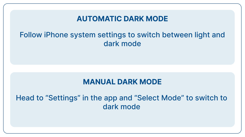 BlueLio supports both automatic system dark mode and manual in-app dark mode settings, giving you flexibility and comfort. Automatic dark mode adjusts based on your device settings, reducing eye strain in low-light conditions without extra effort. Manual mode lets you choose your preferred theme anytime.